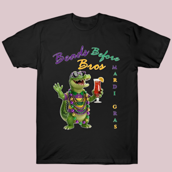 This playful design features a party-ready alligator decked out in jumbo purple, green, and gold beads, rocking sunglasses and raising a festive cocktail. Paired with the bold phrase “Beads Before Bros”.