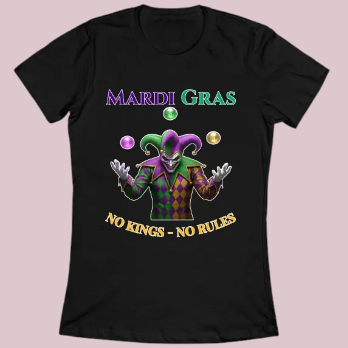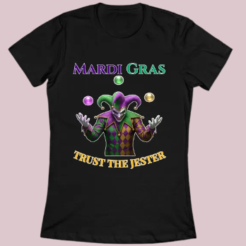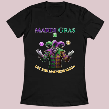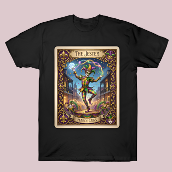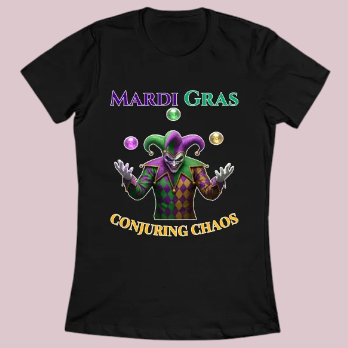 Unleash the wild side of Mardi Gras with this bold graphic tee featuring a sinister jester in classic harlequin colors, juggling glowing orbs of carnival magic. Perfect for parades, late-night revelry, and anyone who embraces the darker, wilder heart of Carnival.